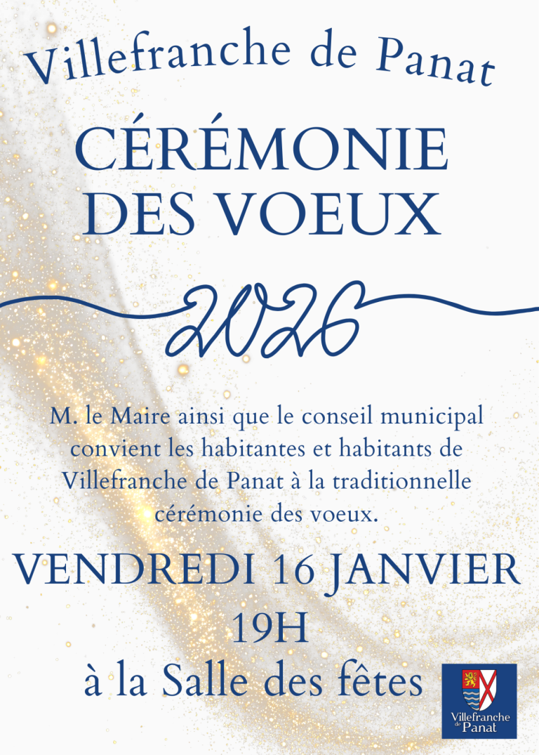 La municipalité de Villefranche de Panat est heureuse de convier panatoises et panatois à la cérémonie des vœux qui se tiendra le vendredi 16 janvier à 19h00 à la salle des fêtes de Villefranche de Panat.