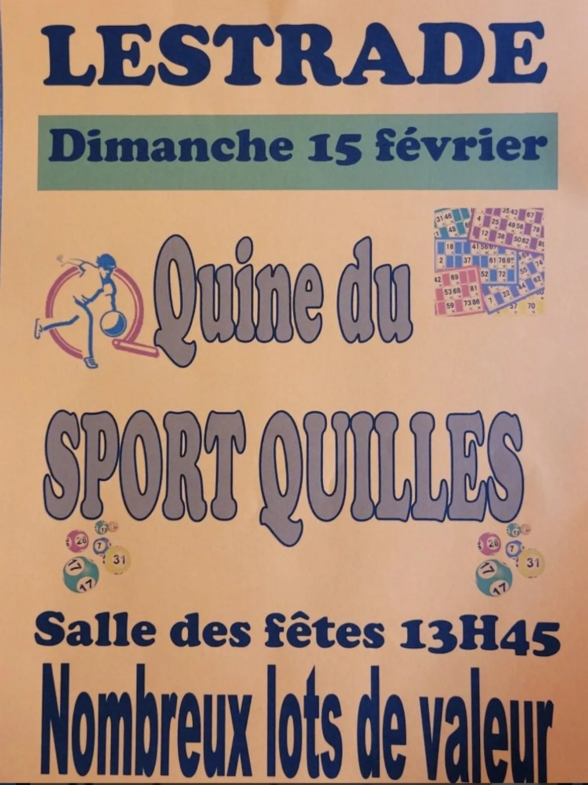 Le club de Sport Quilles vous invite à sa grande après-midi de jeu à la salle des fêtes de Lestrade le dimanche 15 février. De nombreux lots de valeur sont mis en jeu pour récompenser les gagnants de cette édition. Venez partager un moment convivial autour des cartons et tenter votre chance dès le début d’après-midi.