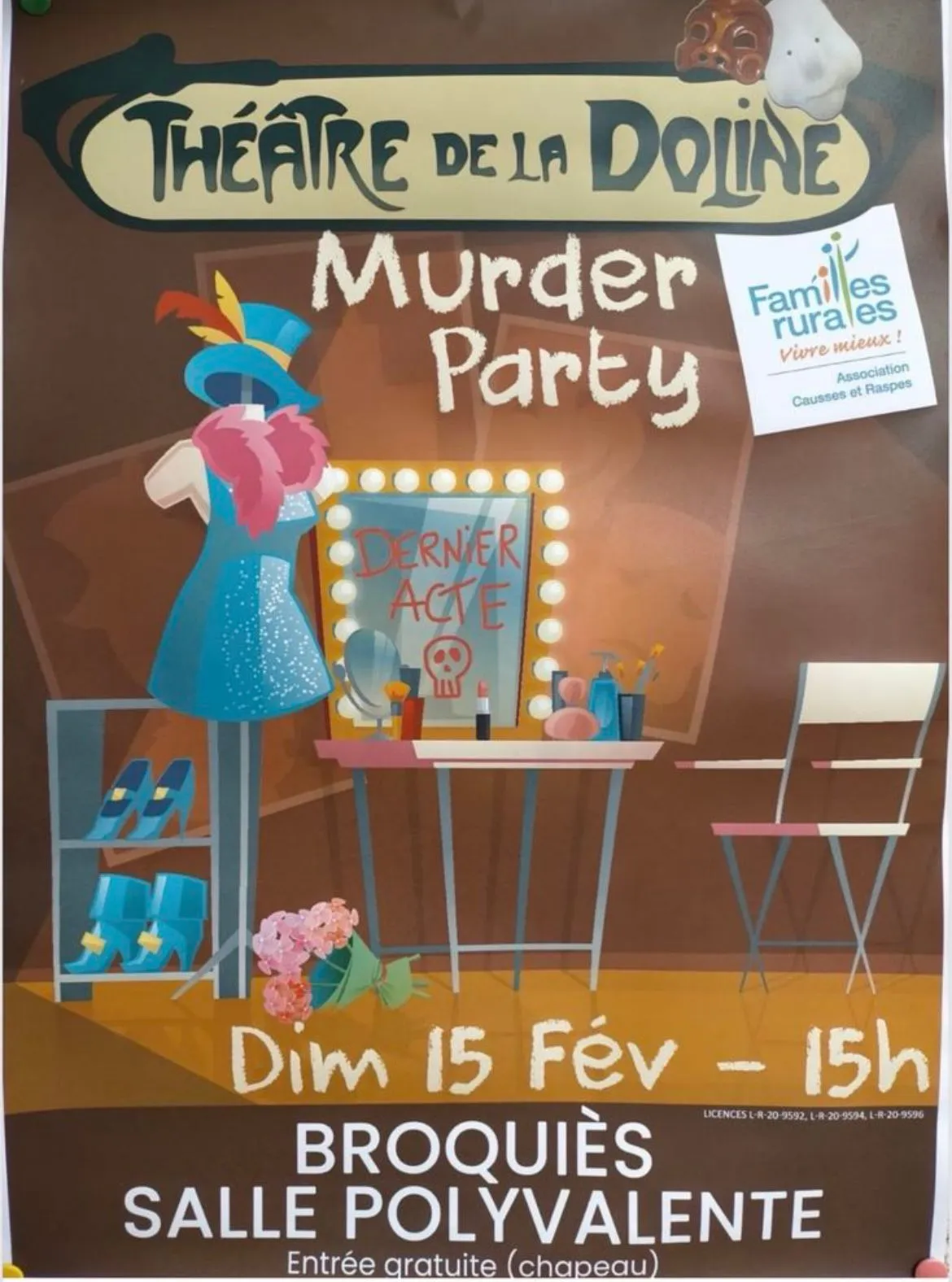 Le dimanche 15 février à 15h, la salle polyvalente de Broquiès change de visage pour devenir la scène d’un mystère où la fiction rejoint la réalité. Sous les projecteurs du Théâtre de la Doline et en collaboration avec Familles Rurales, le rideau se lève sur une intrigue dont vous pourriez bien être la clé.